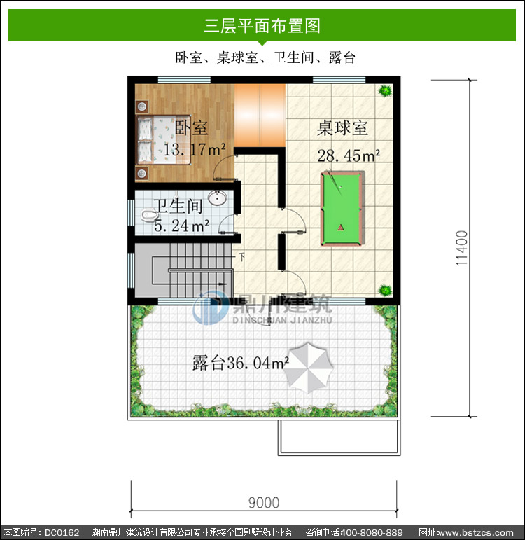 | 三 層: | 臥室、桌球室、衛生間、露臺 | |||