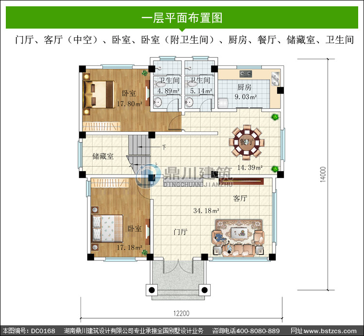 | 一 層: | 門廳、客廳(中空)、臥室、臥室(附衛(wèi)生間)、廚房、餐廳、儲藏室、衛(wèi)生間 | |||