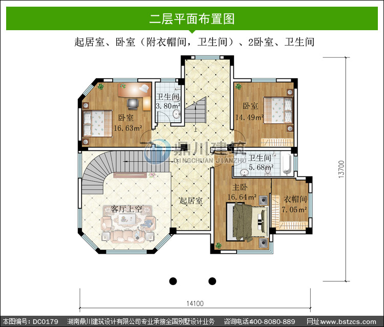 | 二 層: | 起居室、臥室(附衣帽間,衛生間)、2臥室、衛生間 | |||