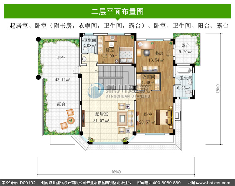| 二 層: | 起居室、臥室(附書房,衣帽間,衛生間,露臺)、臥室、衛生間、陽臺、露臺 | |||