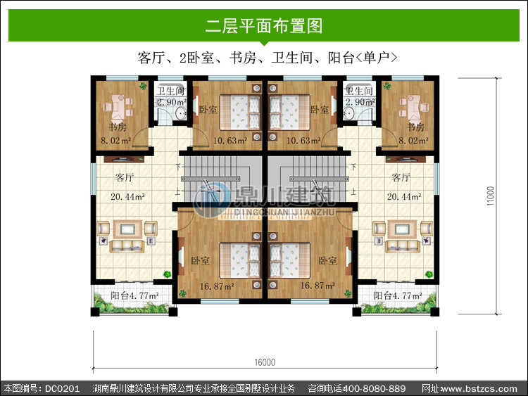 二 層: 客廳、2臥室、書房、衛生間、陽臺