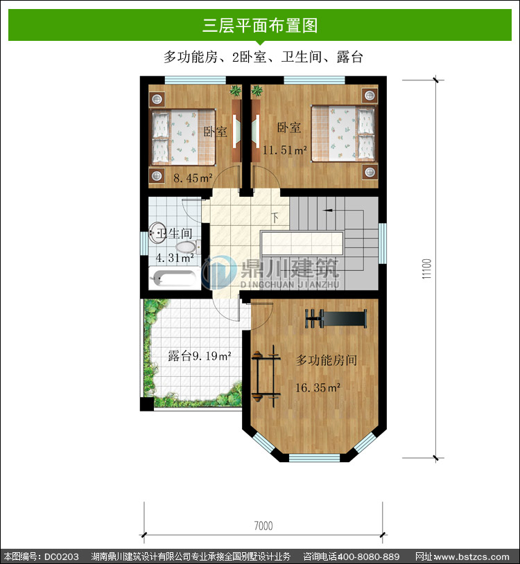| 三 層: | 多功能房、2臥室、衛生間、露臺 | |||