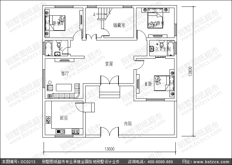 | 一 層: | 內院、堂屋、客廳、臥室(附衛生間)、2臥室、廚房、儲藏室、衛生間 | |||