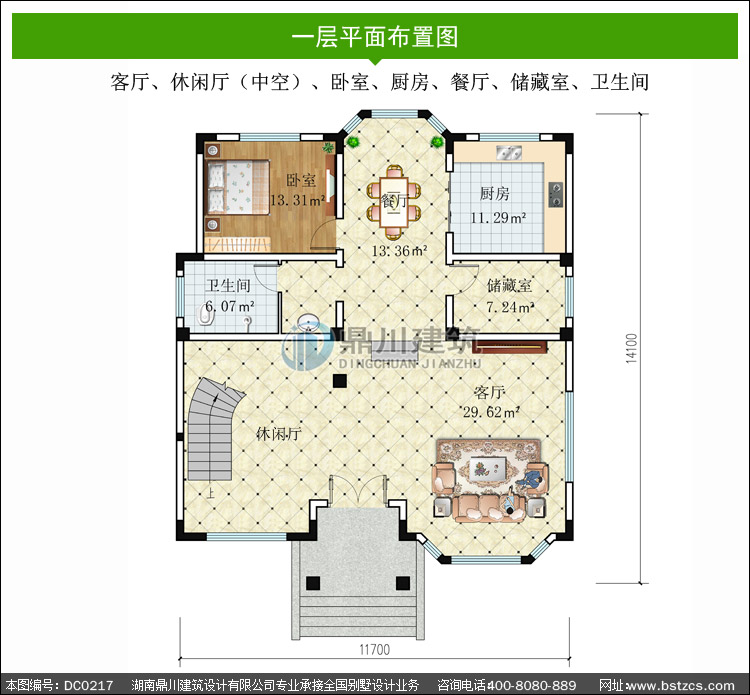 | 一 層: | 客廳、休閑廳(中空)、臥室、廚房、餐廳、儲藏室、衛生間 | |||