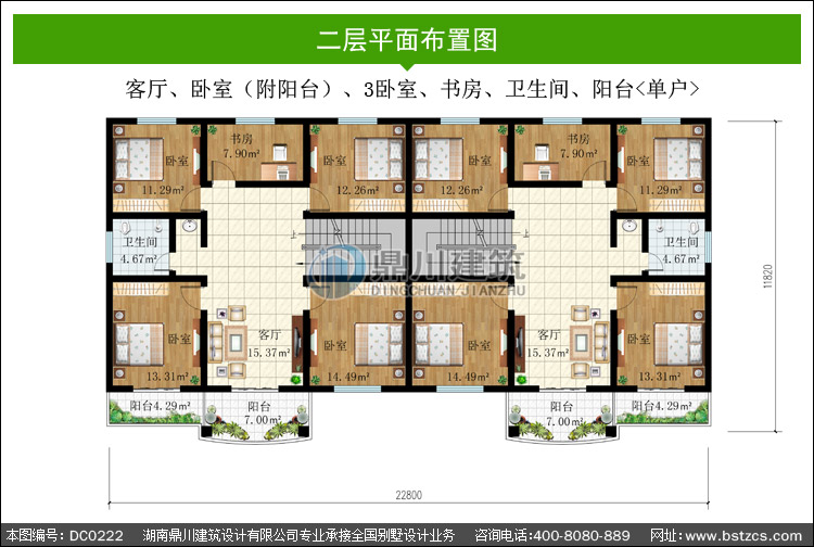 二 層: 客廳、臥室(附陽臺)、3臥室、書房、衛生間、陽臺
