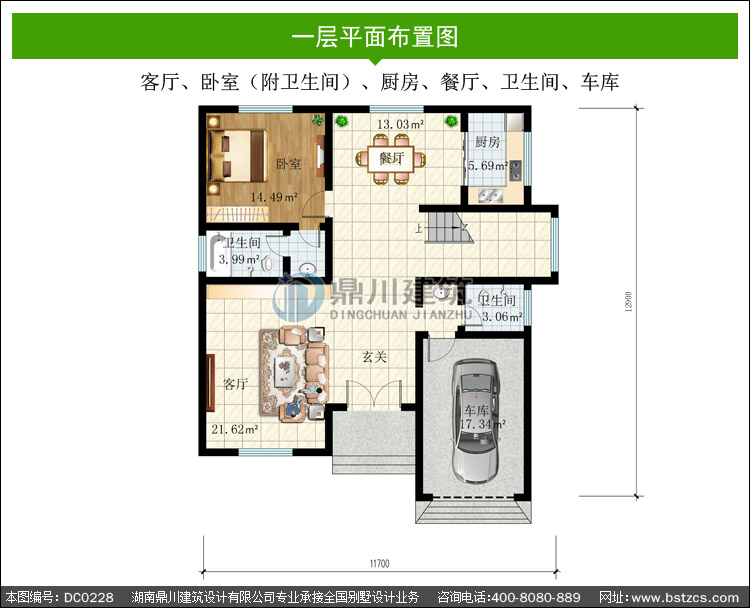| 一 層: | 客廳、臥室(附衛生間)、廚房、餐廳、衛生間、車庫 | |||