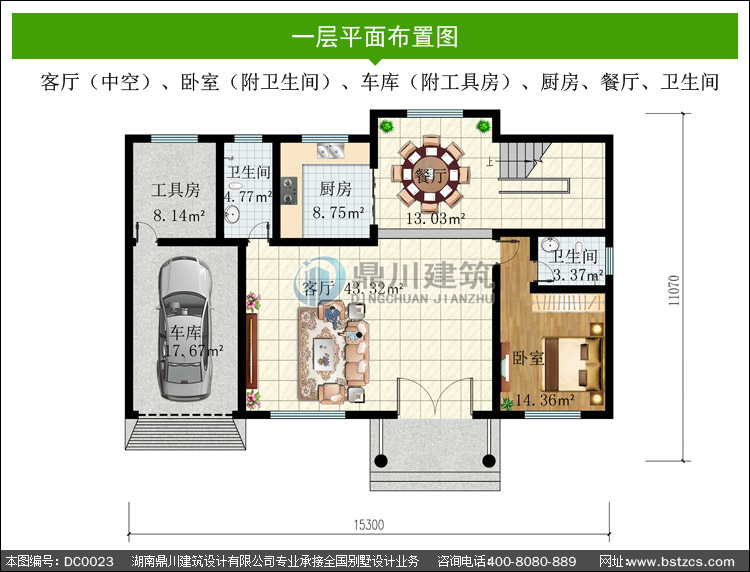| 一 層: | 客廳(中空)、臥室(附衛(wèi)生間)、車庫(附工具房)、廚房、餐廳、衛(wèi)生間 | |||