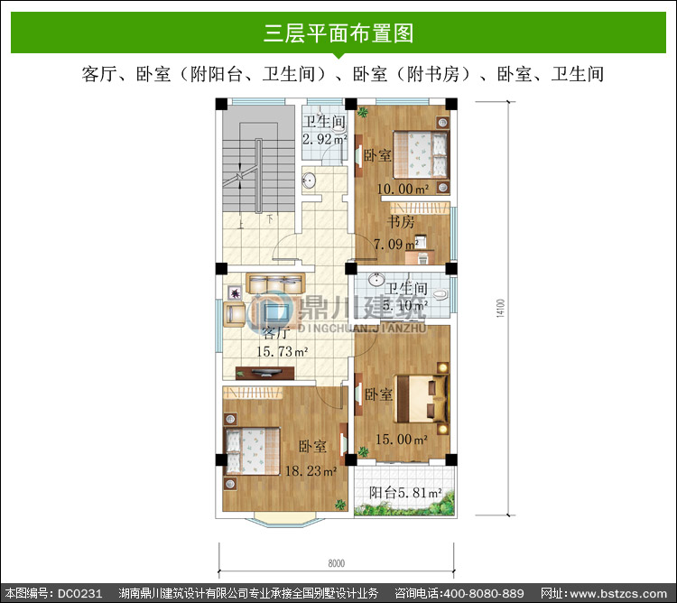 | 三 層: | 客廳、臥室(附陽臺(tái)、衛(wèi)生間)、臥室(附書房)、臥室、衛(wèi)生間 | |||