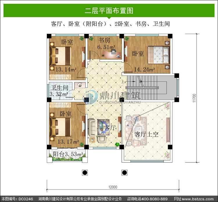 | 二 層: | 客廳、臥室(附陽臺)、2臥室、書房、衛生間 | |||