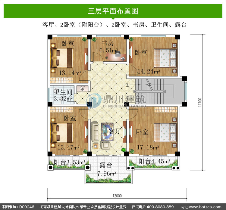 | 三 層: | 客廳、2臥室(附陽臺)、2臥室、書房、衛生間、露臺 | |||