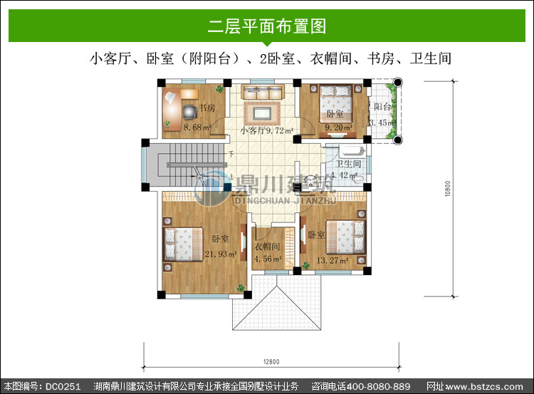 | 二 層: | 小客廳、臥室(附陽臺)、2臥室、衣帽間、書房、衛生間 | |||