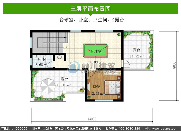| 三 層: | 臺球室、臥室、衛生間、2露臺 | |||