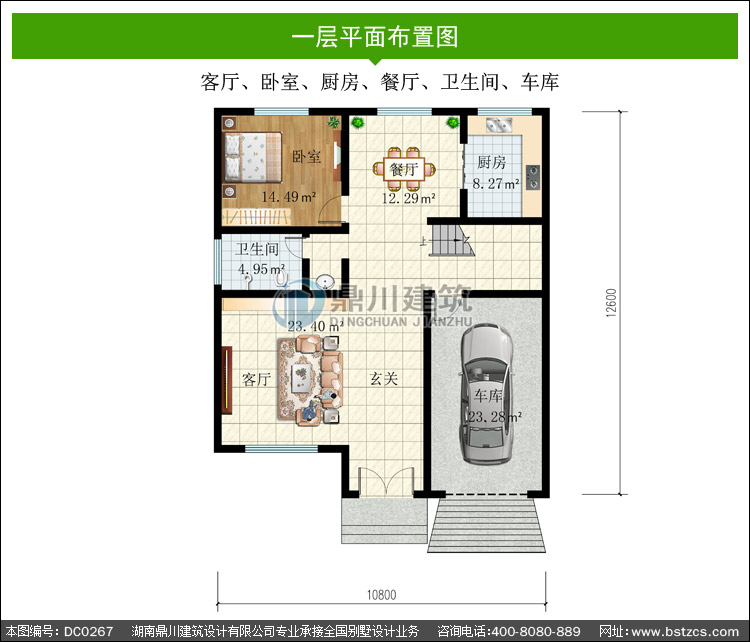 | 一 層: | 客廳、臥室、廚房、餐廳、衛生間、車庫 | |||