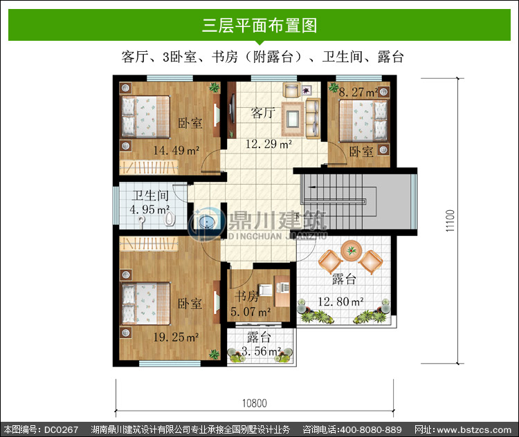 | 三 層: | 客廳、3臥室、書房(附露臺)、衛生間、露臺 | |||