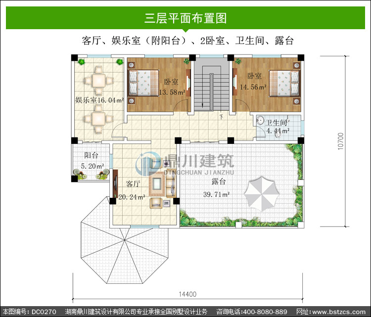 | 三 層: | 客廳、娛樂室(附陽臺)、2臥室、衛生間、露臺 | |||