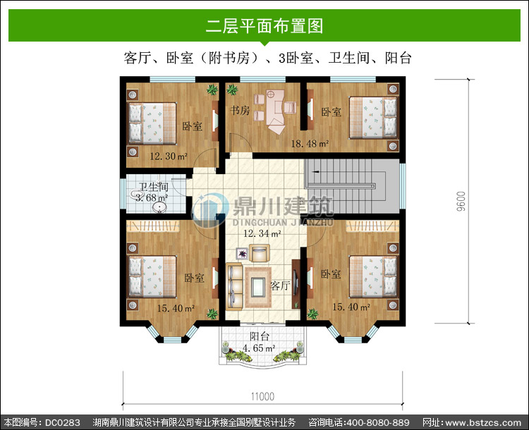 | 二 層: | 客廳、臥室(附書房)、3臥室、衛生間、陽臺 | |||