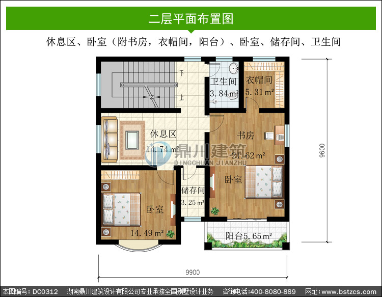 | 二 層: | 休息區(qū)、臥室(附書房,衣帽間,陽臺)、臥室、儲存間、衛(wèi)生間 | |||