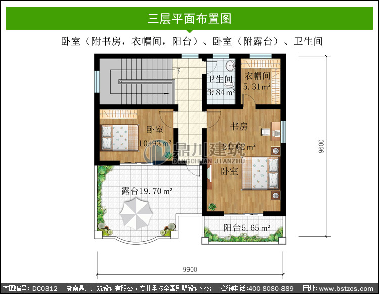| 三 層: | 臥室(附書房,衣帽間,陽臺)、臥室(附露臺)、衛(wèi)生間 | |||