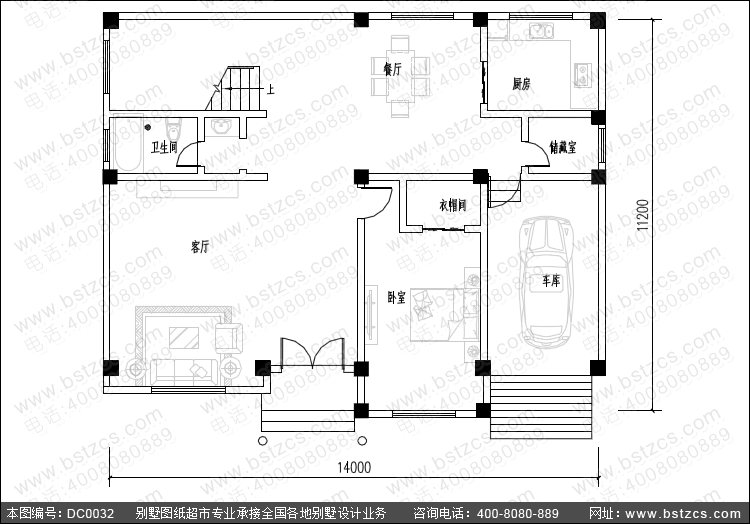 一 層: 客廳、臥室(附衣帽間)、廚房、餐廳、儲藏室、衛生間、車庫