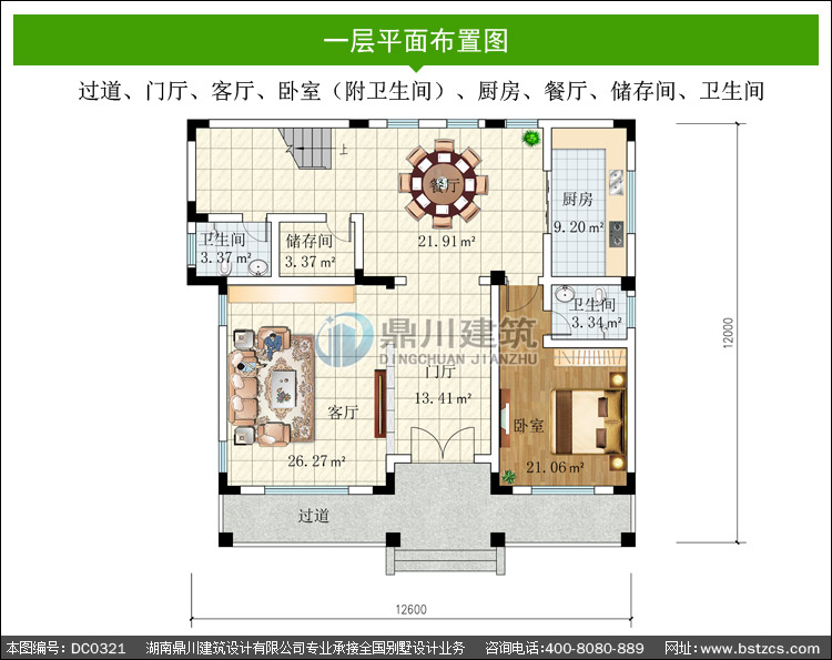 | 一 層: | 過道、門廳、客廳、臥室(附衛生間)、廚房、餐廳、儲存間、衛生間 | |||