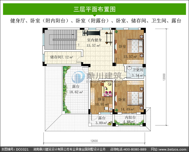 | 三 層: | 健身廳、臥室(附內陽臺)、臥室(附露臺)、臥室、儲存間、衛生間、露臺 | |||