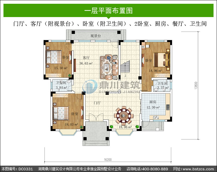 | 一 層: | 門廳、客廳(附觀景臺(tái))、臥室(附衛(wèi)生間)、2臥室、廚房、餐廳、衛(wèi)生間 | |||