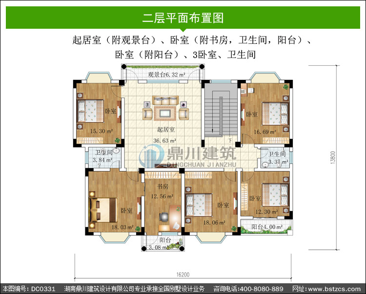 | 二 層: | 起居室(附觀景臺(tái))、臥室(附書(shū)房,衛(wèi)生間,陽(yáng)臺(tái))、臥室(附陽(yáng)臺(tái))、3臥室、衛(wèi)生間 | |||