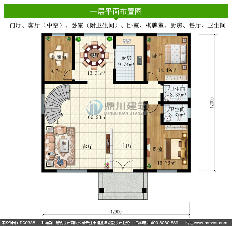 | 一 層: | 門廳、客廳(中空)、臥室(附衛生間)、臥室、棋牌室、廚房、餐廳、衛生間 | |||
