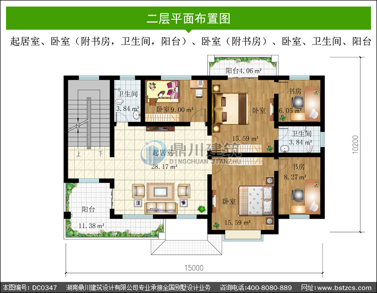 | 二 層: | 起居室、臥室(附書房,衛生間,陽臺)、臥室(附書房)、臥室、衛生間、陽臺 | |||