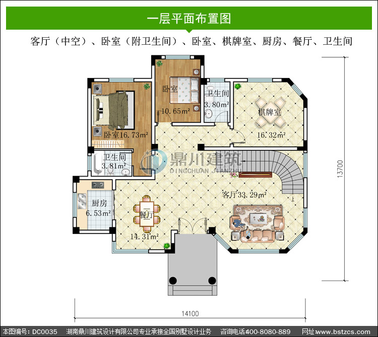 | 一 層: | 客廳(中空)、臥室(附衛生間)、臥室、棋牌室、廚房、餐廳、衛生間 | |||