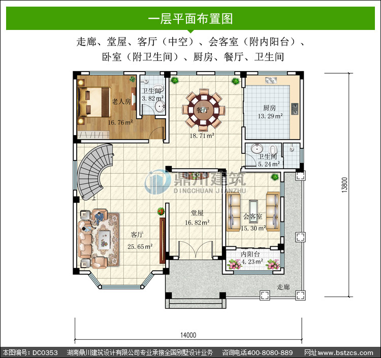 | 一 層: | 走廊、堂屋、客廳(中空)、會客室(附內(nèi)陽臺)、臥室(附衛(wèi)生間)、廚房、餐廳、衛(wèi)生間 | |||