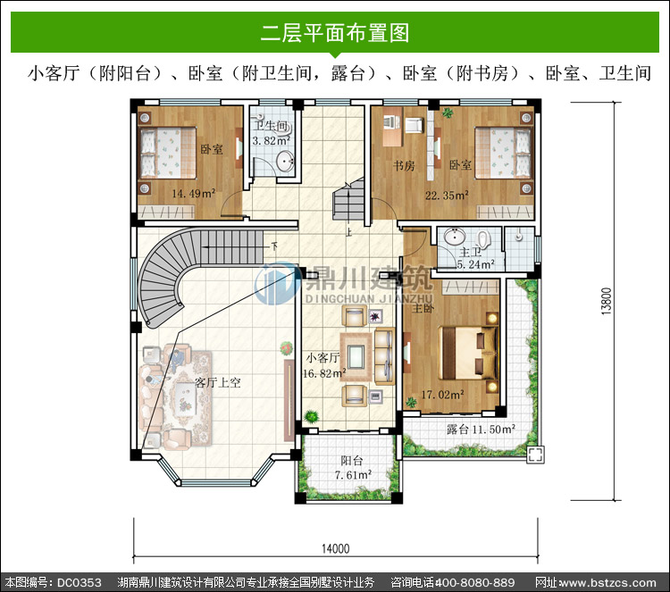 | 二 層: | 小客廳(附陽臺)、臥室(附衛(wèi)生間,露臺)、臥室(附書房)、臥室、衛(wèi)生間 | |||