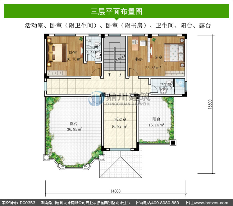 | 三 層: | 活動室、臥室(附衛(wèi)生間)、臥室(附書房)、衛(wèi)生間、陽臺、露臺 | |||