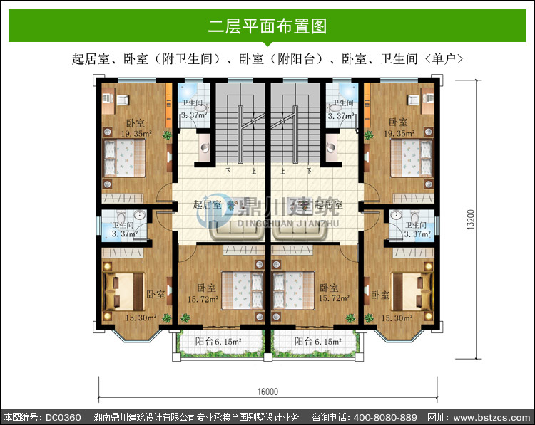二層帶陽臺雙拼別墅設計圖紙_農村雙拼自建房設計圖,鼎川別墅設計