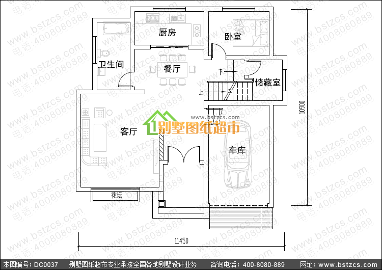 一 層: 客廳、臥室、廚房、餐廳、儲藏室、衛生間、車庫