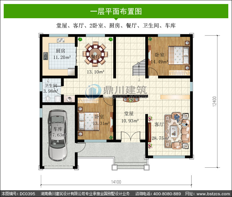 | 一 層: | 堂屋、客廳、2臥室、廚房、餐廳、衛生間、車庫 | |||