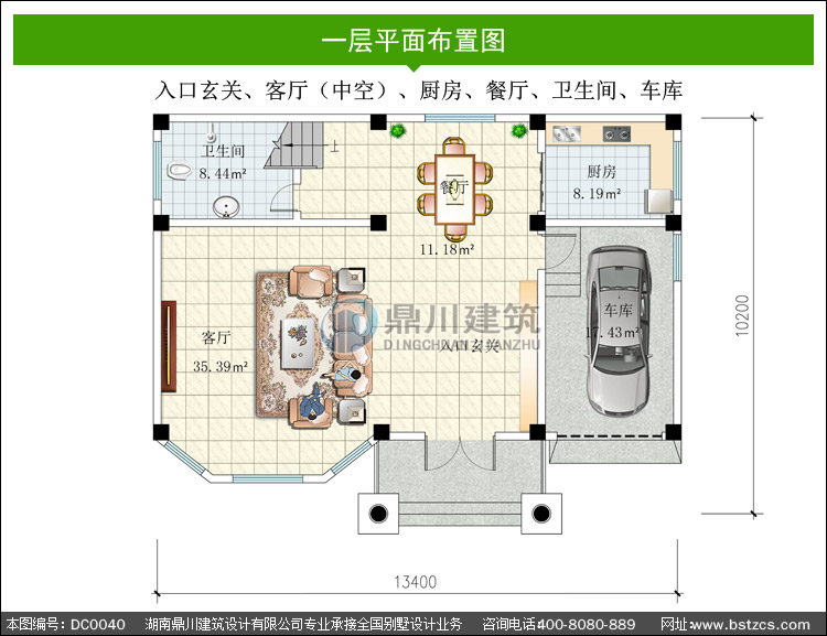 | 一 層: | 入口玄關、客廳(中空)、廚房、餐廳、衛生間、車庫 | |||