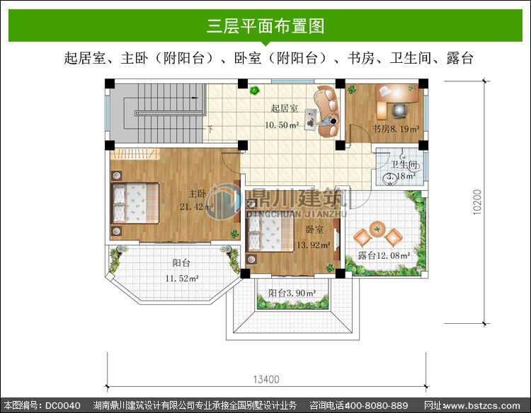 | 三 層: | 起居室、主臥(附陽臺)、臥室(附陽臺)、書房、衛生間、露臺 | |||