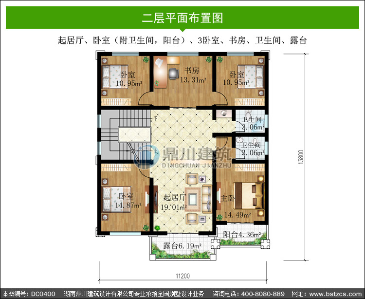 | 二 層: | 起居廳、臥室(附衛生間,陽臺)、3臥室、書房、衛生間、露臺 | |||