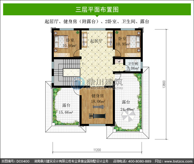 | 三 層: | 起居廳、健身房(附露臺)、2臥室、衛生間、露臺 | |||