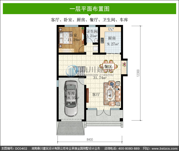 | 一 層: | 客廳、臥室、廚房、餐廳、衛生間、車庫 | |||