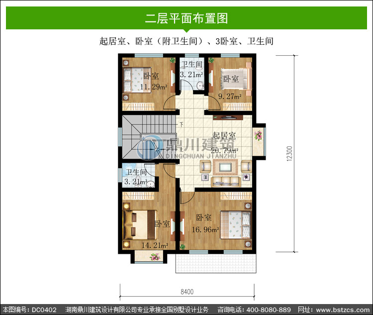 | 二 層: | 起居室、臥室(附衛生間)、3臥室、衛生間 | |||
