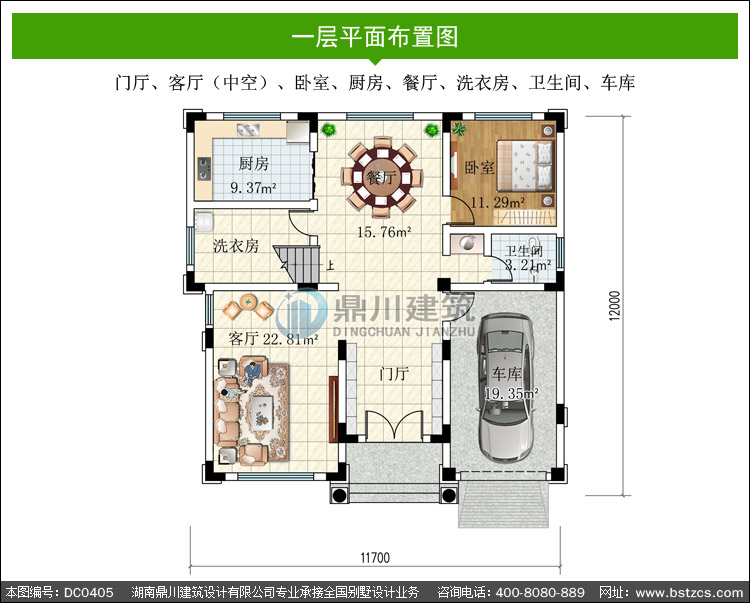 | 一 層: | 門廳、客廳(中空)、臥室、廚房、餐廳、洗衣房、衛生間、車庫 | |||