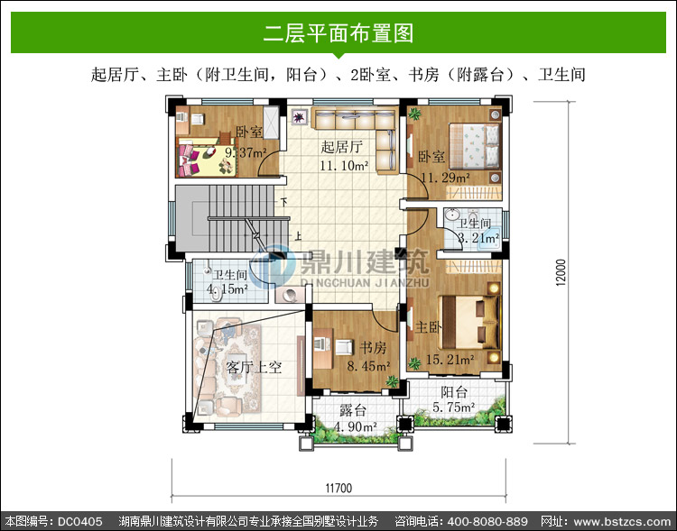 | 二 層: | 起居廳、主臥(附衛生間,陽臺)、2臥室、書房(附露臺)、衛生間 | |||