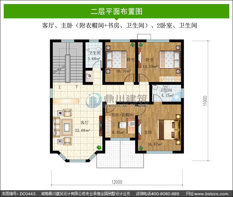 | 二 層: | 客廳、主臥(附衣帽間+書房、衛生間)、2臥室、衛生間 | |||