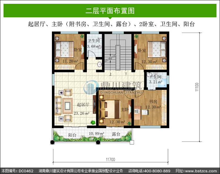 | 二 層: | 起居廳、主臥(附書房、衛生間、露臺)、2臥室、衛生間、陽臺 | |||