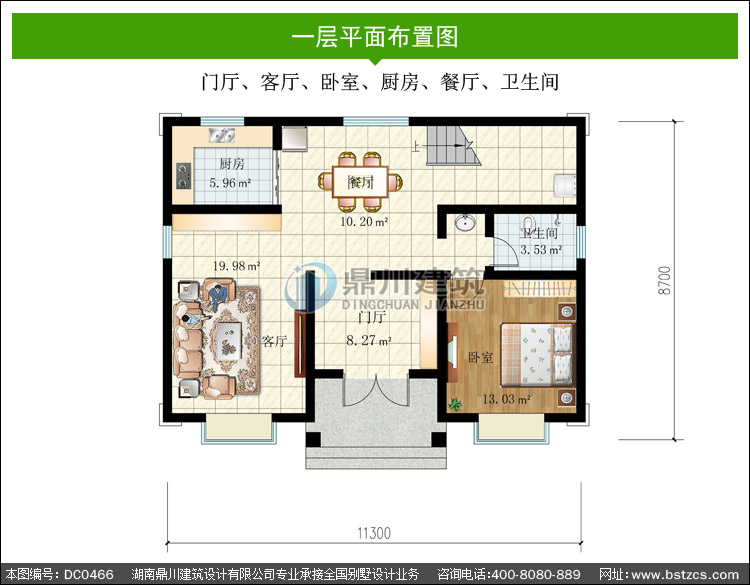 | 一 層: | 門廳、客廳、臥室、廚房、餐廳、衛生間 | |||