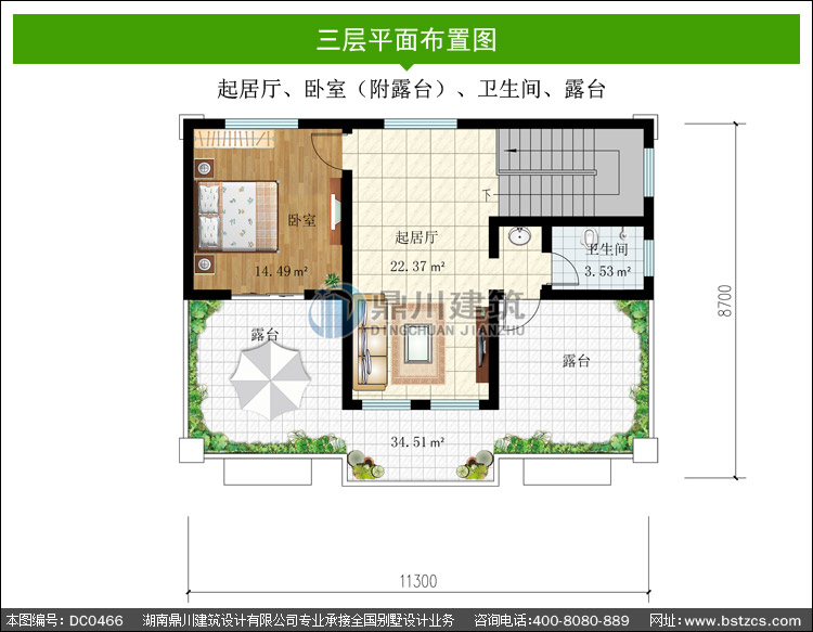 | 三 層: | 起居廳、臥室(附露臺)、衛生間、露臺 | |||