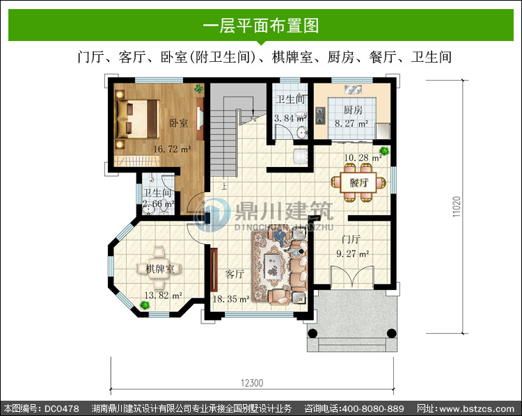 | 一 層: | 門廳、客廳、臥室(附衛(wèi)生間)、棋牌室、廚房、餐廳、衛(wèi)生間 | |||