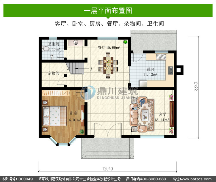 | 一 層: | 客廳、臥室、廚房、餐廳、雜物間、衛(wèi)生間 | |||